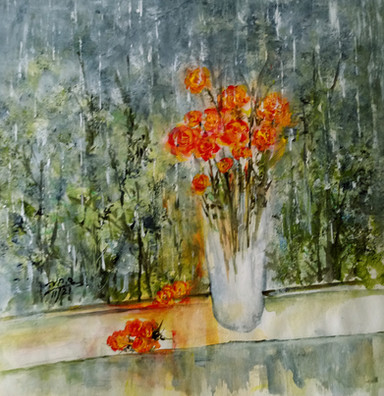 Even the reflected light on the canvas adds to the rain effect and the flowers look like fire thriving in the rain, very cool juxtaposition.Β