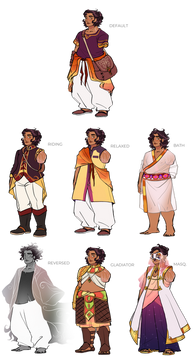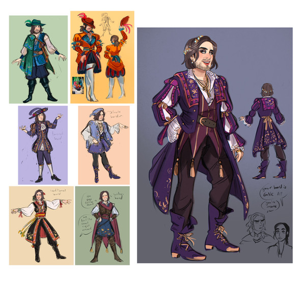He's a captain of a ship that sells stolen goods. He loves money so I wanted to give him some kind of sack to store it in. The kingdom he's from has hot weather and an Arabian kinda style of clothes. I wanted both of these things to come back in his outfit. He is a skirt-chaser and an overall happy guy. Leader of a group of so-called pirates (since they sell stolen goods?) who he views as his family. He's 32 yrs old and his personal assistant secretly adores him