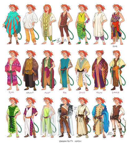 These are all really nice! I think 3 is my favorite of the outfits simply because of how well the top is structured. The outward-sweeping design of the vest bit and the way it overlaps with the tunic creates a really nice triangular pattern that helps guide the eye across it without losing the silhouette, and the poofy sleeves and structure of the half-skirt-thing makes for the most interesting silhouette by far.