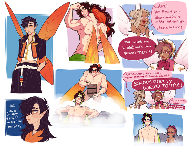 If I could throw in 2 cents, I personally love hair 3 and 4 a lot. Hair 4 is prolly a little bit more of what I would go for. It's more stylish and pirate-like. and Outfit 3 feels like Cap still. He's out at sea a lot so it can get chilly at night. I also love the detailed designs on the skirt part of it. But I like the bag at the hip idea in outfit 4. Cap could keep his money/personal possessions he wants to keep safe inside the bag. Outfit 2's silhouette is still similar to the original. so ya could still keep the long vest/jacket he wears. If that's what you want still. These all look great tho! <3