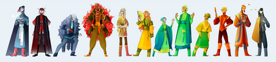 Huaan Since the prince represents a male peacock, I wanted to give all the servents the colors of a female peacock, which is brown and white