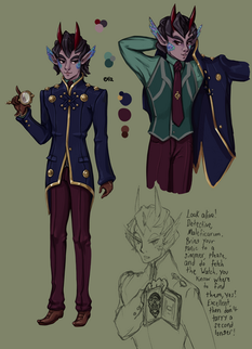 He wears bleeding hearts in his hair, and I gave him a very heart heavy design - and that screamed secretly obsessed to me (yandere even)