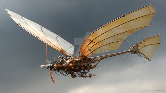 I present to you my latest piece that I have named Soar. This fantasy illustration depicts the successful flight of a man soaring through the sky in a wooden DaVinci-esque flying machine. A bit of a departure from my previous creatures and aliens. After my last work, I decided to scour through webpages, books and other publications to inspire me for my next illustration when I came upon DaVinci’s flying machine blueprint .
