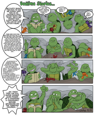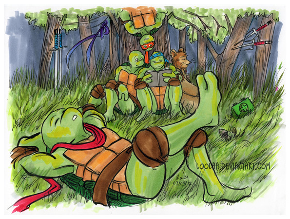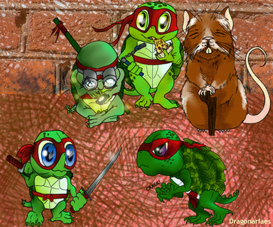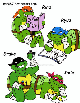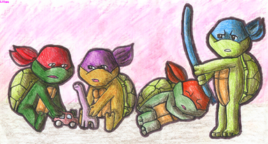 I like how Raphael is playing with the little pony figures, and now he just realized he's been caught in the act. I think this is his all-time fave hobby.^^ I think it's Leonardo who caught him playing with these toys. I think it would be funny if this pic had been a scene from the first TMNT movie. This is my all-time fave out of all your TMNT pics. Excellent job on this pic, it's cute and funny.
