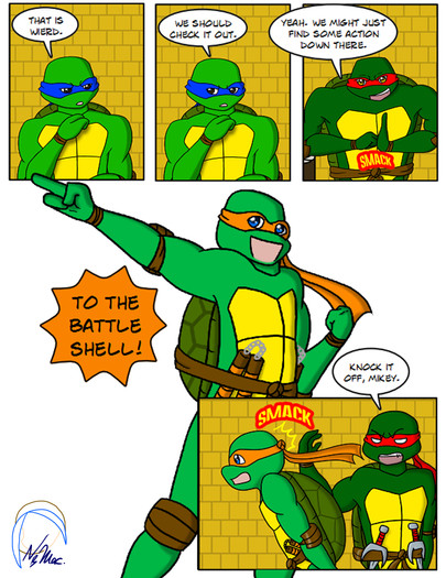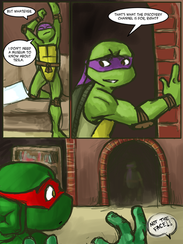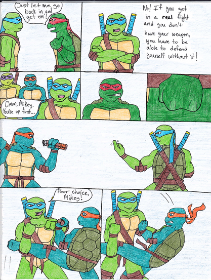 EDIT: Oh yeah, and the reason I have Raph getting revenge on Don and Leo on Mikey in particular is because I figured Leo lecturing Donnie wouldn't work as well.
