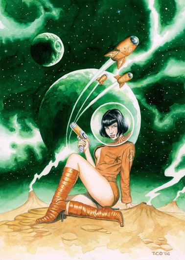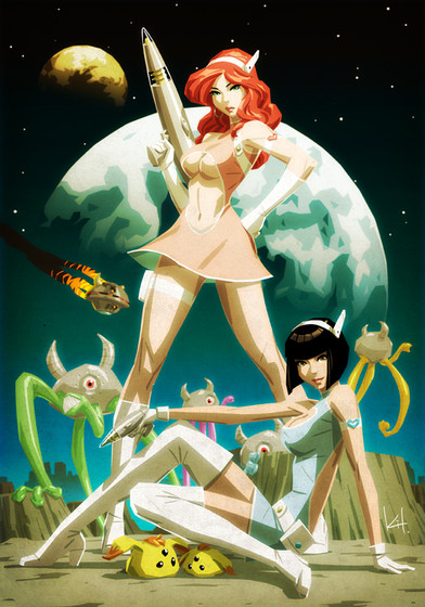 Man, I love this! Space girl is extremely cute, love those long legs! I really like her over the shoulder glance (something sneaking up on her?), and the poor guy running for his life from the monster is awesome!