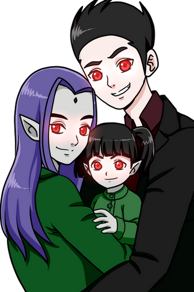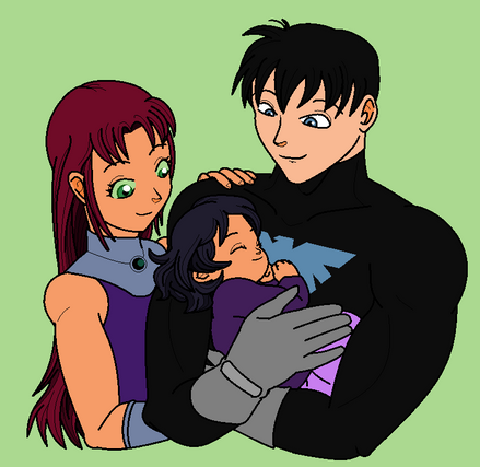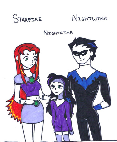 I know canon Nightstar has black hair and her mother's green eyes but I wanted to show more of her father's features. That's why I gave her blue eyes and lighter skin. She still looks like Starfire but with Nightwing's colouring. I like it this way too. ^-^