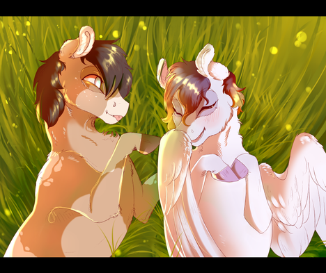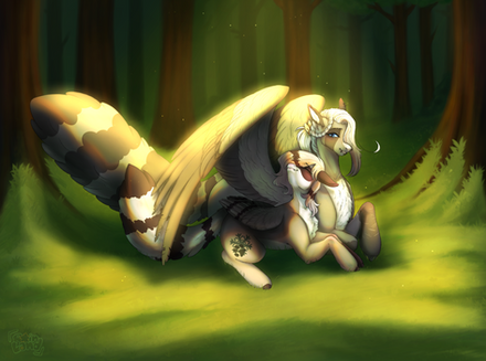 Awww, these two are adorable. I'm not sure what type of animal the character is on top, is it a Hippogriff (which I have recently discovered was an actual mythical animal, lol) or maybe a special type of dragon? Either way, I just love the design of both characters. Not only that, but that sunset hue shading for this picture is just so breath taking. Eeee… I love it!!!