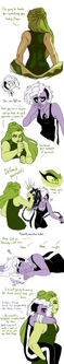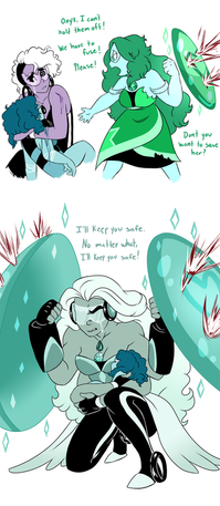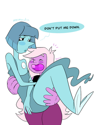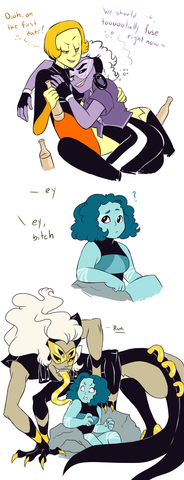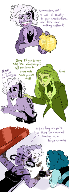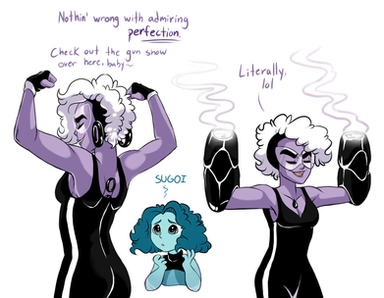 A comic in which Larimar and Onyx successfully fuse for the very first time, and have waaaaay too much fun being a super powerful, destructive giant woman. So much fun, in fact, that Onyx accidentally allowed herself to express actual positive emotions for about a nanosecond. Whoopsee, doodles. Back to what Zircon taught you, Onyx, emotions are for the weakIt was Larimar's first fusion and she loved being big for once. She is much excite for next time pssst Onyx is too