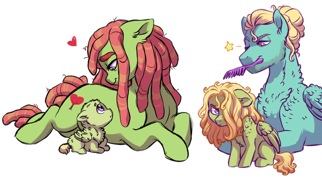 -Although Zephyr had a foal with Treehugger, they were never a serious couple and shared custody of Chakra (though Chakra mostly lived with his mom). Way later, Zephyr ends up happily married to Trenderhoof. They're not interested in having foals, but Zeph desperately wants to reconnect with his son
