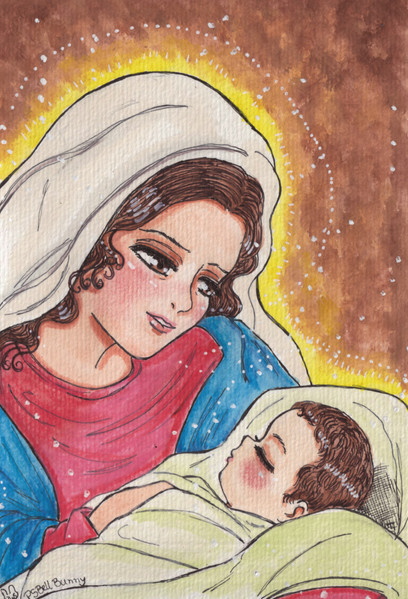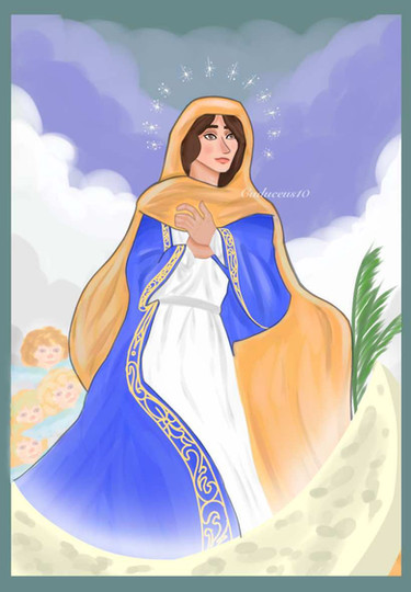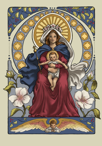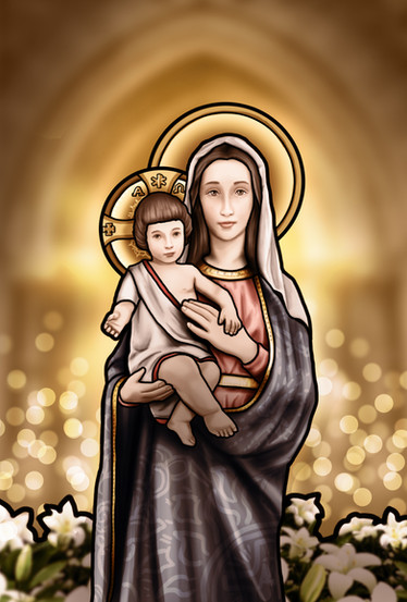 In honor of the Blessed Virgin Mary, and her Assumption. This depicts her along with the child Jesus.