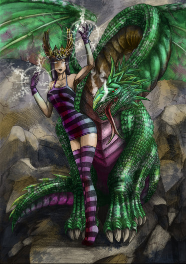 Wonderful colouring as always. I totally adore the patterns on her clothing, as well as the fire effect and the blue glows on her wings. So beautiful, both fiery-demoniac and cold.