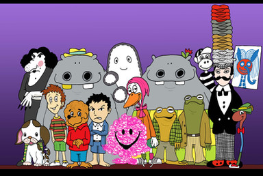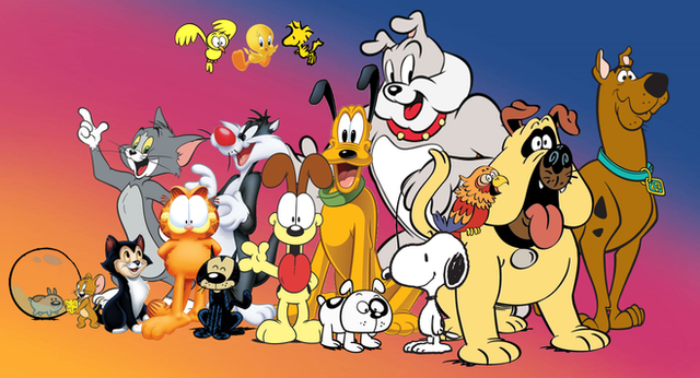 Sure!Β Left to right:Β Droopy Dog, Mickey Mouse, Casper the Friendly Ghost, Bullwinkle J. Moose, Underdog, BugsBunny, Papa Smurf, Fred Flintstone, Mighty Mouse, Woody Woodpecker, ScoobyDoo, TweetyBird, Rocky the Flying Squirrel, Yogi Bear, Jiminy Crickett, Alvin Chipmunk, Jerry Mouse, Betty Boop, Inspector Gadget, Felix the Cat, Dangermouse, Fat Albert, Popeye, Mr. Magoo, Tom the Cat and the Pink Panther!