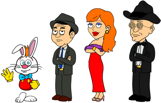 The descriptions of the characters aren't 100% complete, but there are enough details to form an image. This is my interpretation of the Roger, Eddie Valiant and Jessica Rabbit, based on those descriptions.