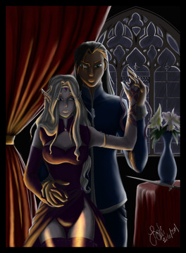 Oh it turned out absolutely BEAUTIFUL! I LOVE the deep red of her dress and the sheen of her hair. The folds in the curtians are perfect, and the blood spatters too, they look very natural. I also like the skull and the way it's shaded, as well as the bones upon which she sits.