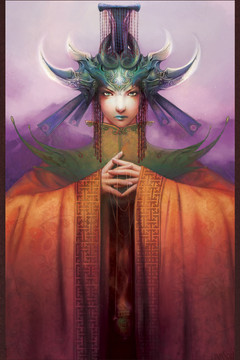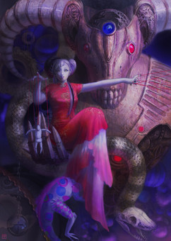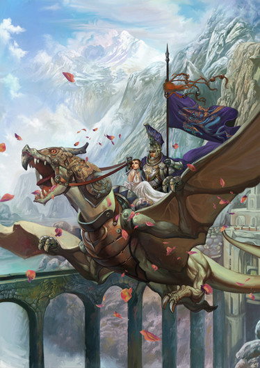 Though the wonderful mechanical parts and the woman's outfit are captivating, I am continually drawn to the dragon and how well the colors merge together.