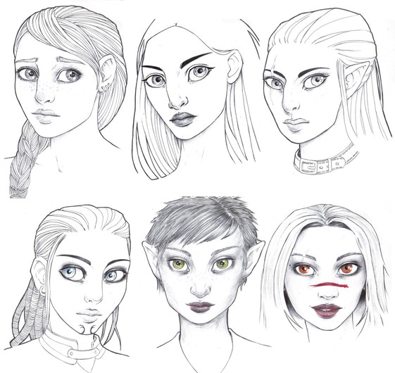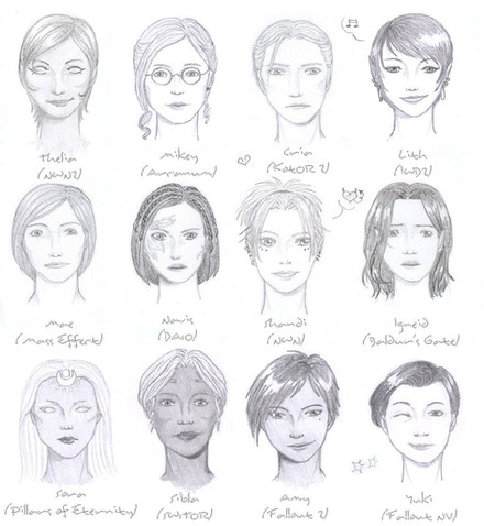 A batch of women's portraits. Mostly a tribute to Bioware games, since they were mostly drawn while I waited for something to load.First from left is Suki from A:tLA, and than: Shepard - ME, Cousland from DA: O, Shepard, random Asari, my vision of Tali without her helmet - all from ME, ? with ?, CharName, my NWN2 character, ?, ?, ?, ?, two of my real-life friends and between then Hawke from DA2, and the right bottom corner is dedicated to DA: O.