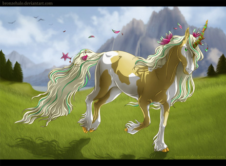 Wo-ow, that is one of the most beautiful colouring jobs I've seen in a long time! The light and shadow, just to die for! His eyes are fantastic, not overly bright or overbearing. And I completely adore that background, incredibly realistic grass and cloud cover. The only thing I'd pick on is his feathery legs and the beard, they seem to distract a little from his overall dignity... but that may just be my personal thing of feathers and beard in unicorns showing through.