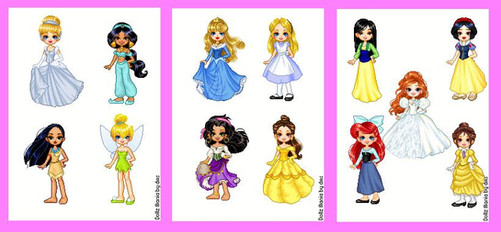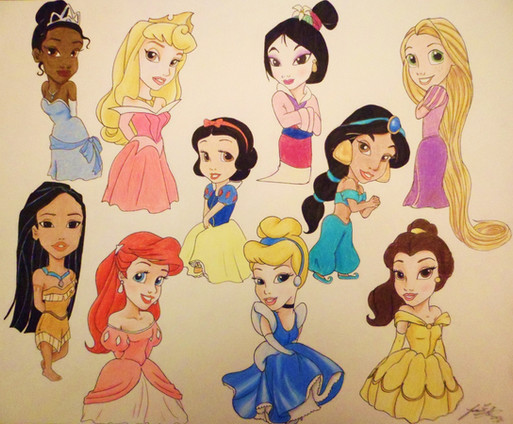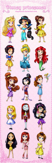Rapunzell, Gisele, Belle, Ariel, Megara, Jane, Alice, Cinderella, Tiana, Mulan, Aurora, Thinkerbell, Pocahontas, Jasmine, Snow White.Related content