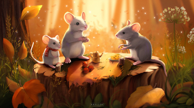 I keep finding more of your mice paintings and keep loving them! They're not only absolutely adorable, but the colors and lighting!! So nicely done! And the textures!! I love how there's so much "personality" to the mice in each of these scenes.