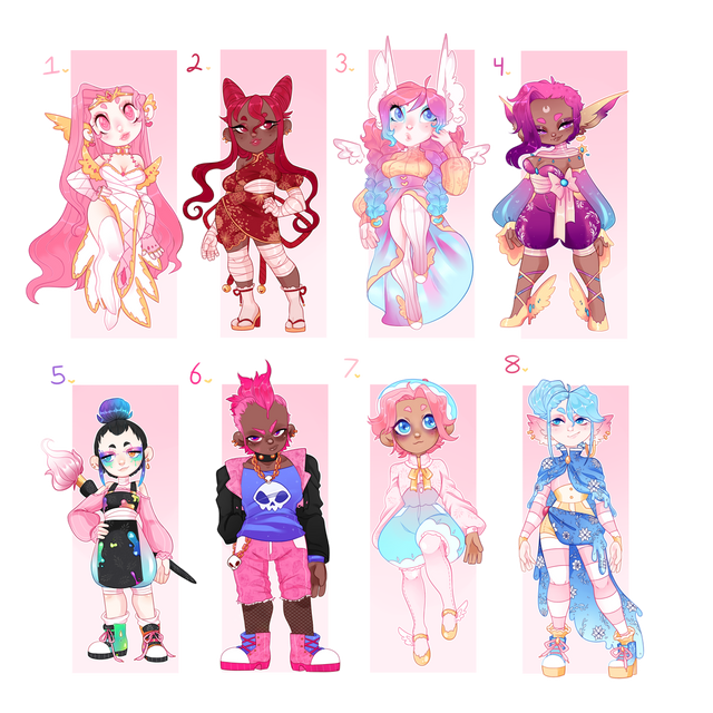 I have never been more proud of my designs than these i want to keep all of them so badly but i need the funds more, holy shit. The first angel here is actually a redesign of an old oc of mine that was a tootheye LOL (Miella, if you remember her!) and the fourth gal is from one of my original art pieces!