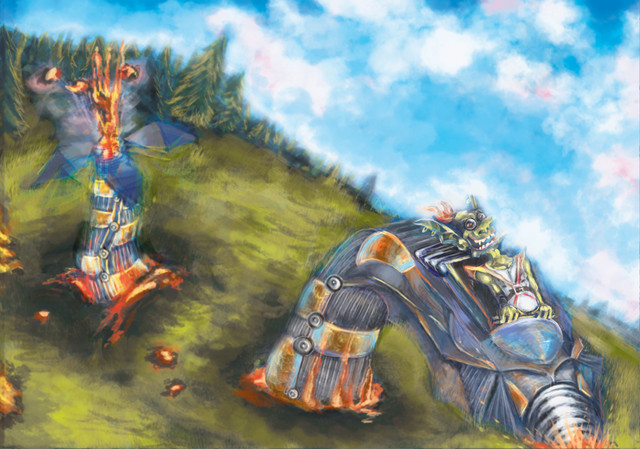 For s competition in hisMartins termites, or Marmites as they are more commonly known as are named from the famous explorer August Martin who wrote the first real books about them before they spread over most of the Floating Lands. Rather ordinary termites except that they have gained low level telepathic abilities through evolution. This gives the habitants of a termitemound the ability to share their individualy limited brains into a shared mind with a intelligence about as strong as a average human. The marmite intelligence eventualy developed their own kind of steam technology. The marmite mounds are now mobile, armored and armed to defend them from predators and enemy marrmite mounds. They quickly spread all over the floating lands from a now forgotten island of origin. They have little interest in things outside their mounds and never attempt to communicate with other sentient races. The marmites usualy never attack first but you should keep your distance to a mound as they will attack anyone who come too close, usualy after a few warning shots.