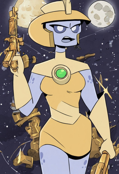 Her outfit is spectacular! Is she with a gun or a weapon in her hands?