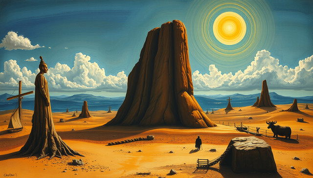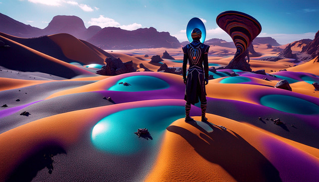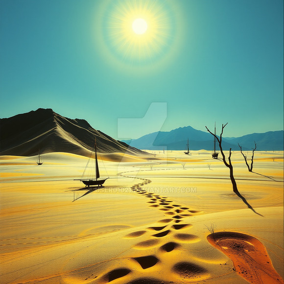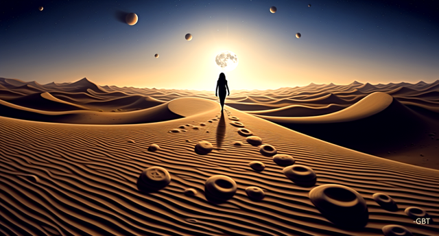 #wallpaper #surreal #render #abstract #alignment #blue #celestial #circle #contrast #cosmic #desert #dreamscape #dunes #footprints #horizon #minimalism #monolith #passage #sand #silence #solitude #sunrise #symbol #trajectory #transcendence #vast
