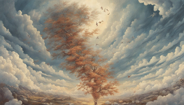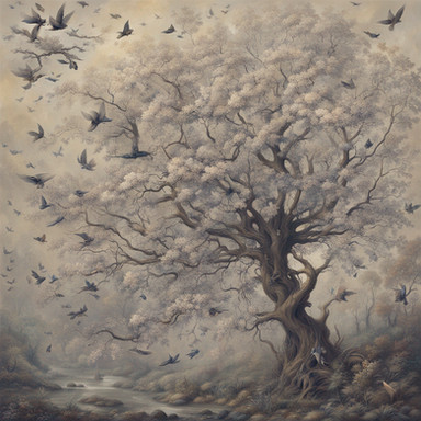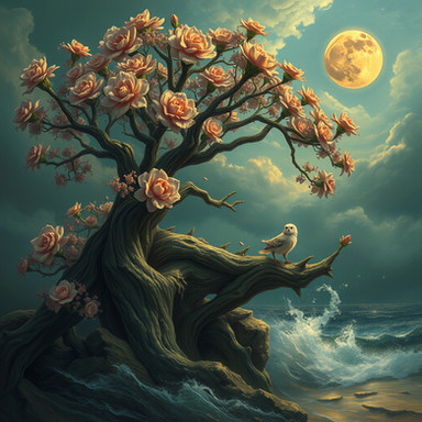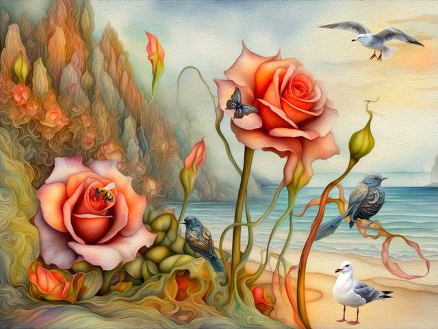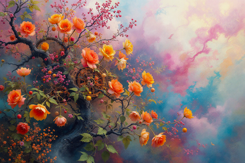 #birds #blossoms #branches #clouds #colorful #dreamlike #fantasy #nature #peaceful #romantic #roses #serene #sky #softlight #songbirds #surreal #tree #whimsical