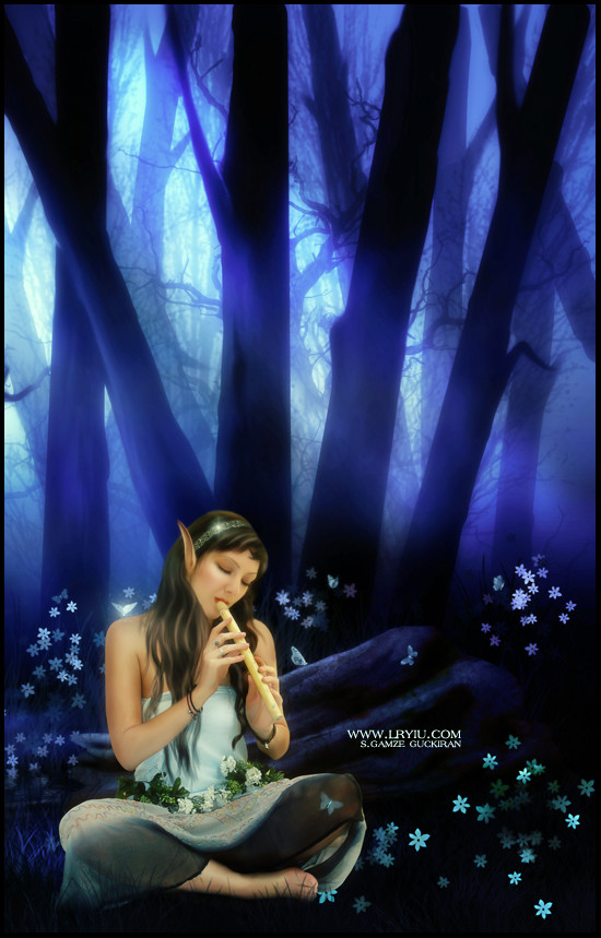 Pretty colors, it reminds me of a girl I would like. Things look a bit flat though, or maybe just embossed. Try looking more closely at the shadows in the stock photo. Also, her fingers are bit blurry; it looks like you used the Smudge tool often. (Is it a Photoshop Painting?) The smudge tool can create some good results, but sometimes it makes things too soft. It works pretty well here (assuming you did use it, i dunno).