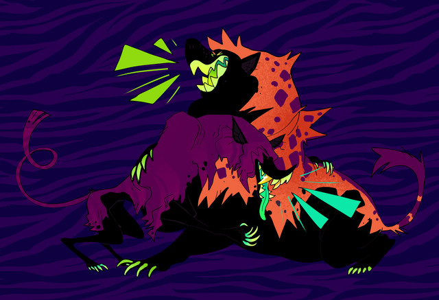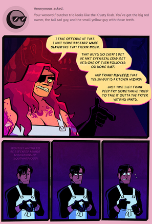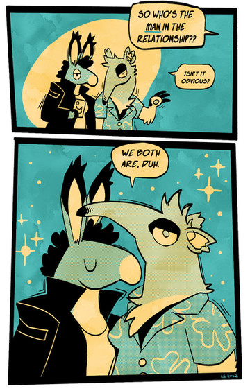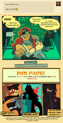 Now, I've submitted a lotta fanart here, but my main thing is actually OCs. I have quite a few and some goofy settings/worlds/stories go go with. These 2 are my two main guys. The art quality here's a little shoddy and aged from how I draw them now, but this felt like a good piece to introduce them and their friendship with.The monster gal is Sam, she's a lycomorph which is her world's equivalent of a werewolf. The dude, Ike, is her sidekick/friend/business associate. Together they're extremely overqualified for the low level mercenary/bounty hunting work they get hired to do, but there are reasons they can't get better work...