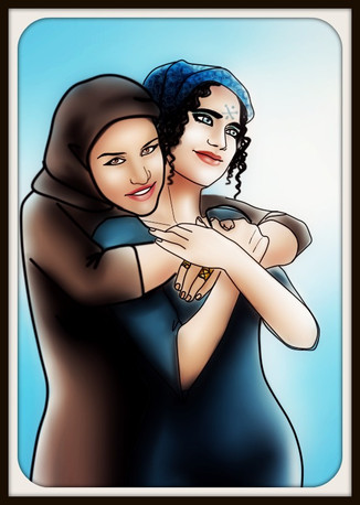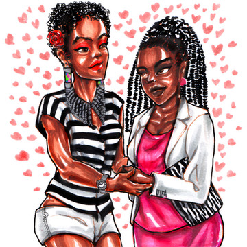 Two ladies in love, taking a walk on a river bank by night.Or something like that.