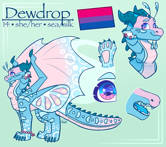 I finally made a ref for Dewdrop! Now I no longer have to guess where spots go when I draw her. Even though she is a RainWing, I'm not going to have her scales change color based on emotion because then it wouldn't really look like Dewdrop if she was all red when she's angry. But she'll still change her scales for camouflage and whatnot.Art and character belong to me