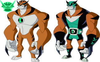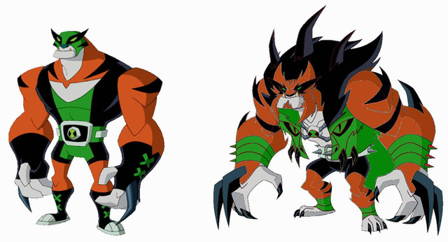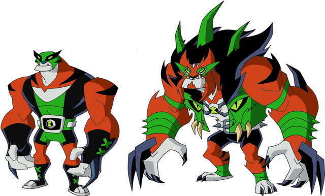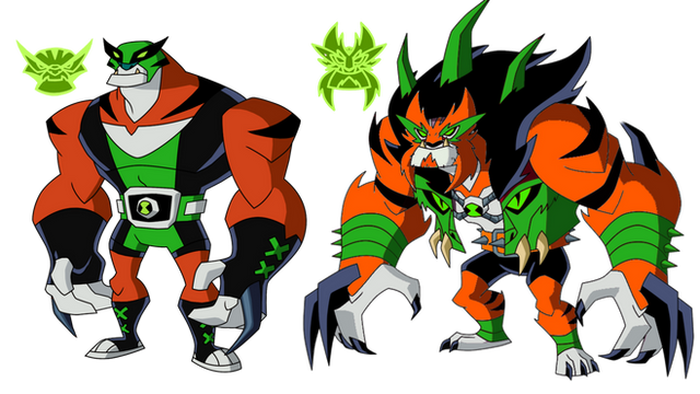 a comparison between rath and his ultimate form (after ben learned aplexplaxions are supposed to wear clothes from vexx and malice. ben got rath updated to wear a luchador outfit)Related content