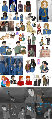 here's a bunch of sketches I've done over the last while relating to Fallout, featuring my lone wanderer Redmond (angry teen with one eye) and sole survivor Everett (small blonde dad)haven't played NV yet but I plan to so....maybe there'll be some art of that in the future since I know a bunch of ppl love that game