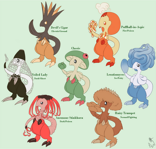 Yep! All the names right next to them are the names of actual mushrooms! You should go google them! The real things are a lot cooler than how I drew them. XD I had to simplify them for the sake of making them more Pokemon-esque.