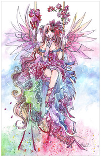I love the slightly blurred look, with no dark lines separating characters and backround. The hair on the characters is so pretty. It looks light and windswept. The girl has a very pretty, wholesome face. The guy looks serious and cool. My favorite parts are the girl's dress and the tree with it's gorgeous blossoms (what kind of tree is it?). A suggestion I have is to blend the guy's elbow area more and lighten up the glove. Very pretty otherwise.