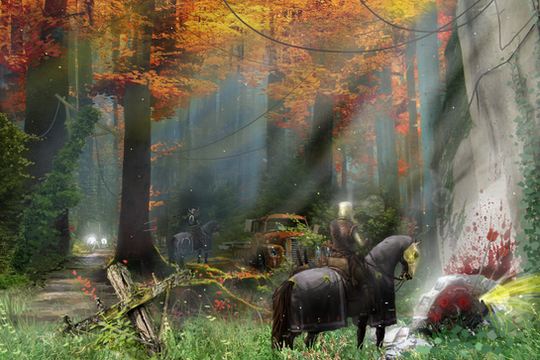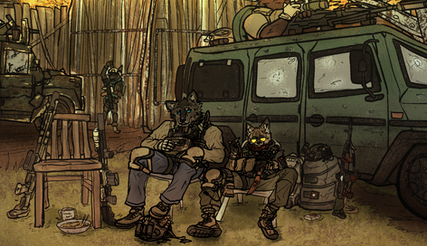 "Digging a Hole"A bit fantasy about Withers in XXl century. Nothing much to say about that, just fellow witcher master is sitting on the dead Gryphon body and having a rest (he is getting old tho).