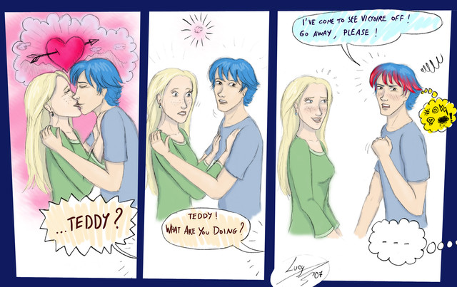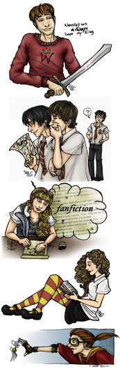 3. 6th Year Gryffindors: This is adorable! I would love to see it as a real drawing. Everything is perfect. This is one of those drawings where it's all about the expressions: Ron looking scared at Lavender's clinginess, Lavender looking happy and in love and... well, clingy, Harry and Parvati's weirded-out expressions, and Hermione off on the side looking furious, and refusing even to look at Ron and Lav. Dean and Seamus are drawn perfectly, and of course I love Neville with Trevor on his head. Oh, and I love that you have Harry holding his copy of Advanced Potion Making. Great detail!