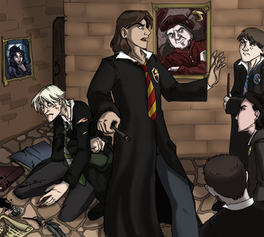 I love it! So many great details--expressions, motion as the kids are stopped dead in their tracks, Luna's hairpins and the wizards peeping out of the frame! Fantastic!