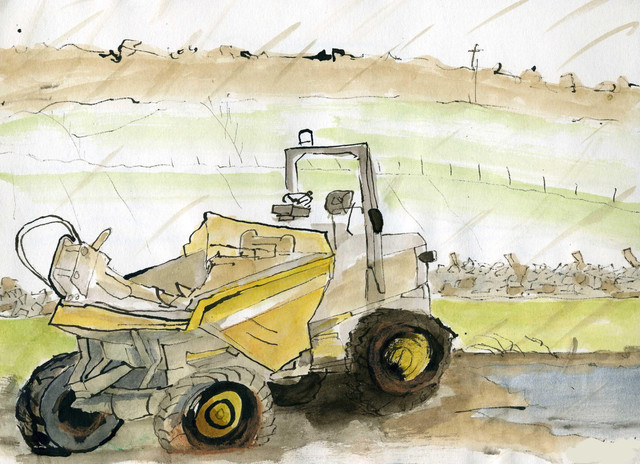 I love the colour, the thick black outline that draws it towards you, and the "unperfectness" (is that even a word?) of the tractor. If the tractor was drawn perfect, it wouldn't look half as good. Very nice job!