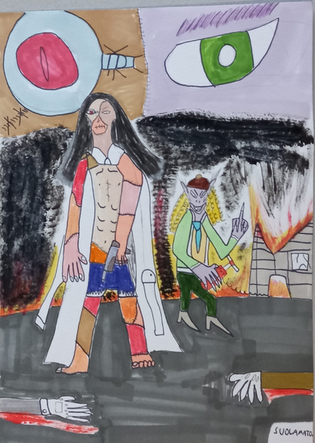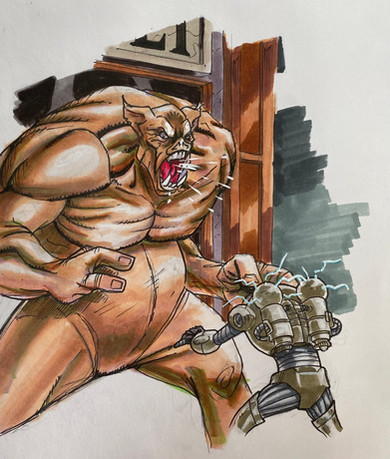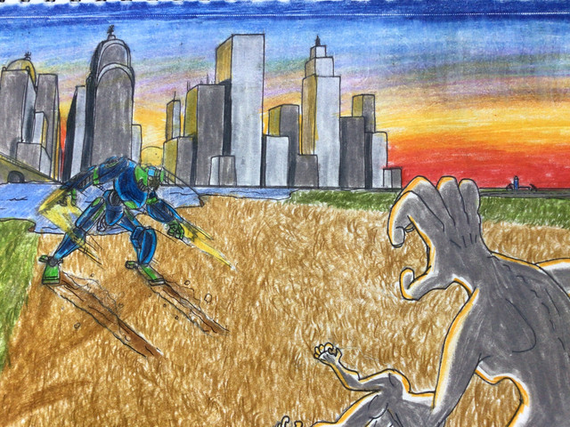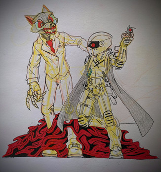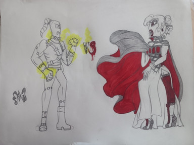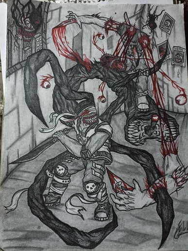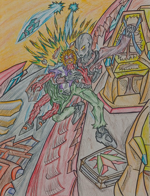 I love the action poses here and the detail paid to all the injuries both characters have sustained. They have REALLY been in the wars, but with a clash-of-the-violence-titans situation like that, I would expect nothing less. You put a heck of a lot of effort into the background, and even the rolling clouds of the Emptiness! I envy that - I'm a spoiled digital artist brat & can't work well with traditional means at all.