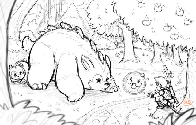 It's really cute! I t looks like these creature can't eat apples because they are to hard to catch on the trees and so this little boy uses his magical power to pick some apples to feed this poor animals and then they become friends! I like the contrasted colors and the cute scenery of these work! Well done LuigiL. Hope to see more of your work soon!