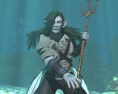 This warrior elf is Raen Darktide, a longtime friend of Caspian's. The two love to go out fishing together, or hunting for sharks with their tridents and spears.