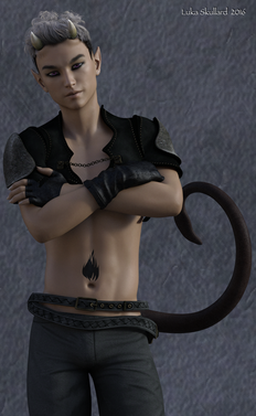 I've been working on this sweetheart for a few weeks now, trying to get him to look just the way I want him to. After going through many incarnations, I think I'm fully happy with this one. He is a new character design who has not yet appeared or been played within our RPG adventures. He may end up one of the "gallery only" characters, but who knows? Time will tell, and there are lots of adventures still ahead!Stranger hasn't told me his real name yet, so we'll just call him by his alias for now. He's intelligent, quiet and very quick with his blade. Stranger is the descendant of a tiefling male and an air genasi (sylph) female. He didn't end up with his father's tail, but he certainly got the horns! He also was blessed with his mother's pale skin, szuldar and silvery eyes. He also has some of her magic, and likes to fight his enemies with the combination of blade and spell.