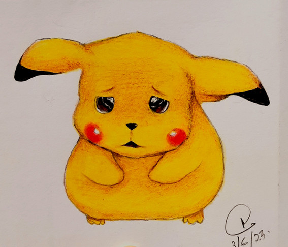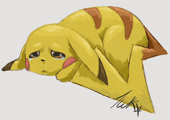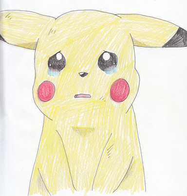 Here is a picture of crying Pikachu, from Pokemon: The First Movie. It is made using Watercolour and Ink.This has taken 3 attempts overall, it was not necessarily hard to draw it was just i kept getting the background or the eyes wrong. Unfortunately this scan is as sharp as the original artwork is, but this is out of my hands to be honest