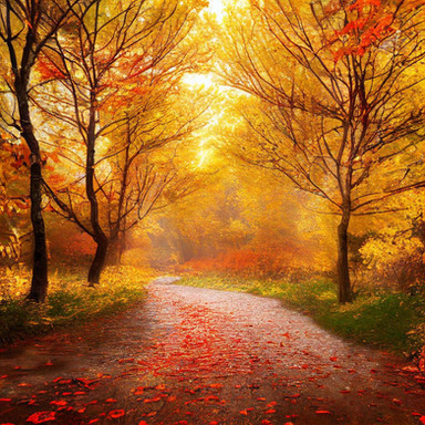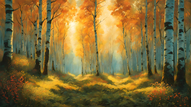 Incredible sense of depth and serenity to this painting. Majestic golden trees and the tiny Geisha wandering through the forest makes this perfect