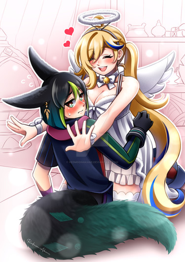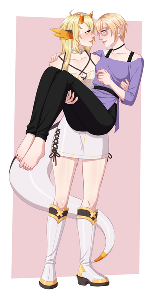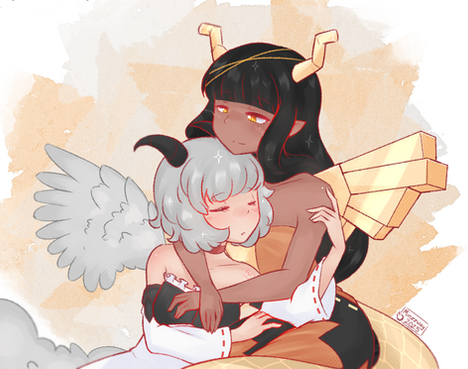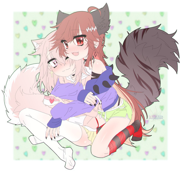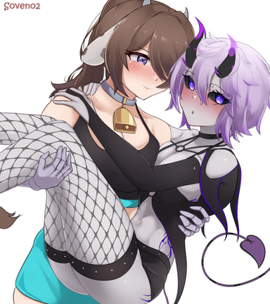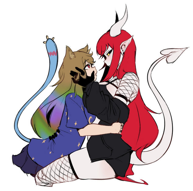 #animegirl #yuri #cuddling #cute #dress #emo #horns #hugging #kawaii #love #originalcharacters #shorts #skirt #socks #stockings #tail #wagging #wings #kemonomimi #cow_girl #tube_top #wagging_tail #owl_girl