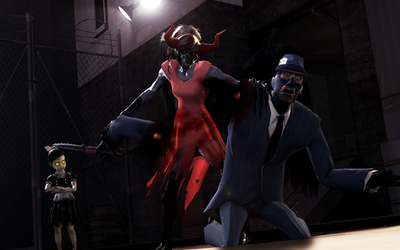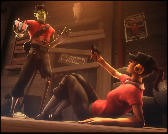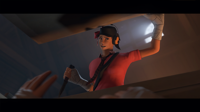 Hm. Makes me wonder if the one she just killed was RED or BLU. Oh wait. I can see a bit of RED there. Was that RED Soldier? Or a Spy!