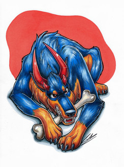 You can see that he went through some stuff over the years and protects what is important to him (represented by the bone) in a strict yet not brutal way. He has a good heart^^ I had lots of fun colouring him on vacation (yes, I took some markers with me lol) and some people watched me do it! Kinda was a little like a livestream haha. Anyways, I am very happy with the result and he will be for sale, soon!